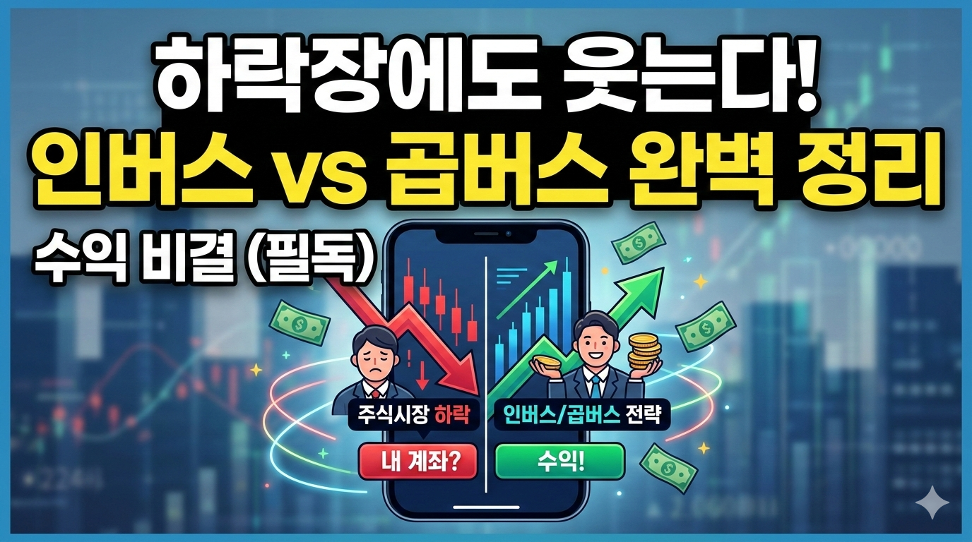 최근 주식 시장의 변동성이 커지면서 "내 종목만 떨어지는 것 같다"며 한숨 쉬는 분들이 많습니다. 코스피와 코스닥 지수가 힘을 못 쓰고 하락할 때, 대부분의 개인 투자자들은 '강제 존버(버티기)'에 들어가거나 손절을 고민하게 되죠.하지만 고수들은 하락장에서도 웃음 짓습니다. 바로 주가가 떨어질 때 오히려 수익이 나는 '인버스'와 '곱버스'라는 무기가 있기 때문입니다.오늘은 주식 초보자들도 5분 만에 이해할 수 있도록 이 용어들의 개념부터 실전 투자 주의사항까지 핵심 내용만 알기 쉽게 요약 정리해 보았습니다. 1. 인버스(Inverse)란 무엇인가? 보통의 주식은 내가 산 가격보다 주가가 올라야 수익이 납니다. 하지만 인버스(Inverse)는 말 그대로 '역(逆)'의 방향으로 움직이는 상품입니다.◈ 핵심..